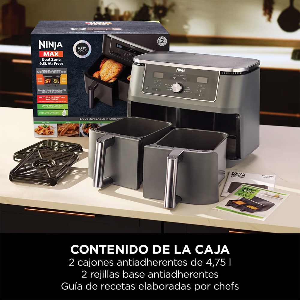 اقلام همراه: سرخکن دوقلو نینجا فودی، دو سبد با ظرفیت کلی ۹.۵ لیتر، صفحات پایه نچسب و قابل شستشو، دفترچه دستور پخت سرآشپز.
